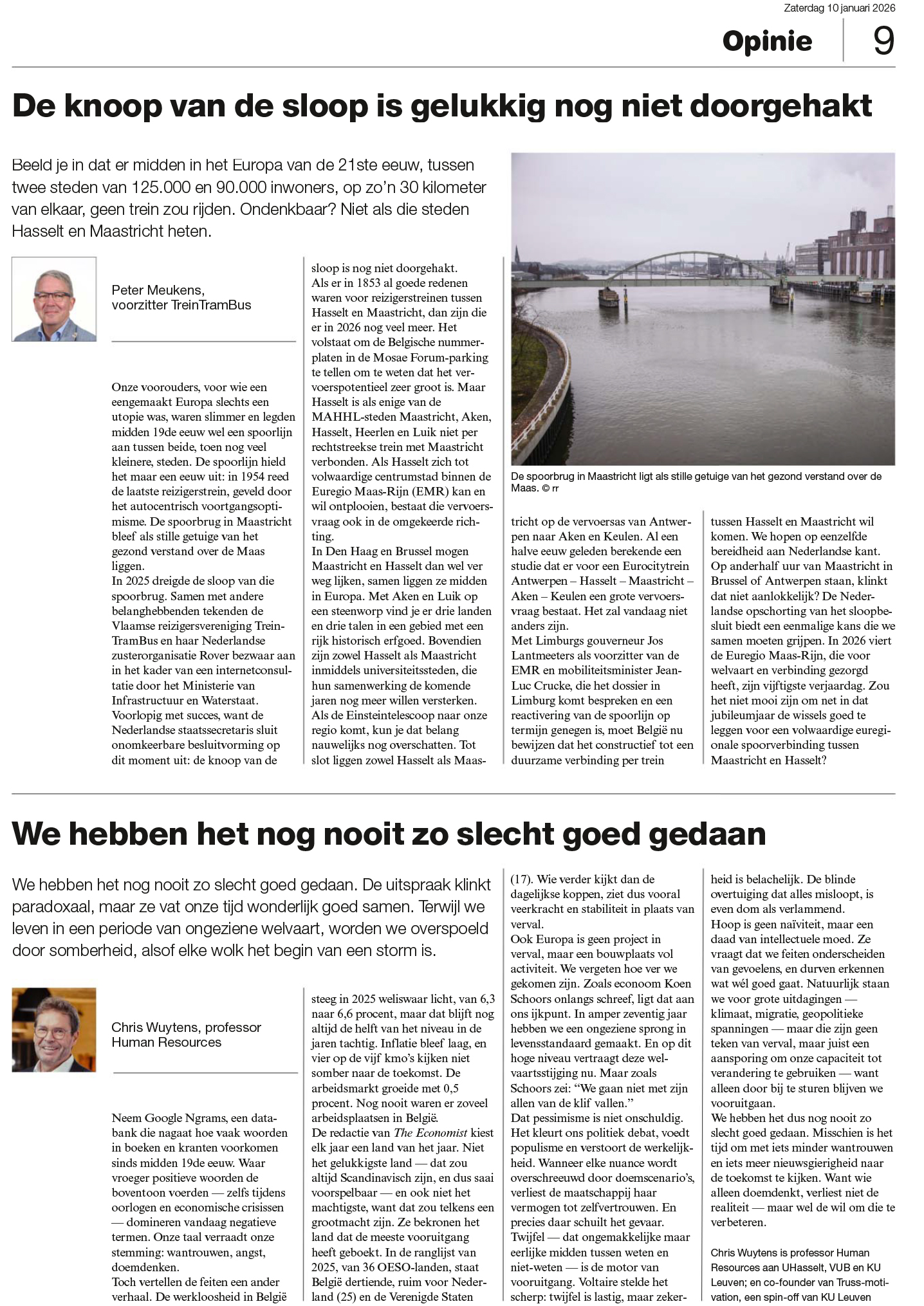 Het Belang van Limburg en De Limburger hebben afgelopen week de euregionale primeur mogelijk gemaakt dat een opiniestuk over de spoorbrug in Maastricht gelijktijdig aan beide zijden van de Maas gelezen kon worden.